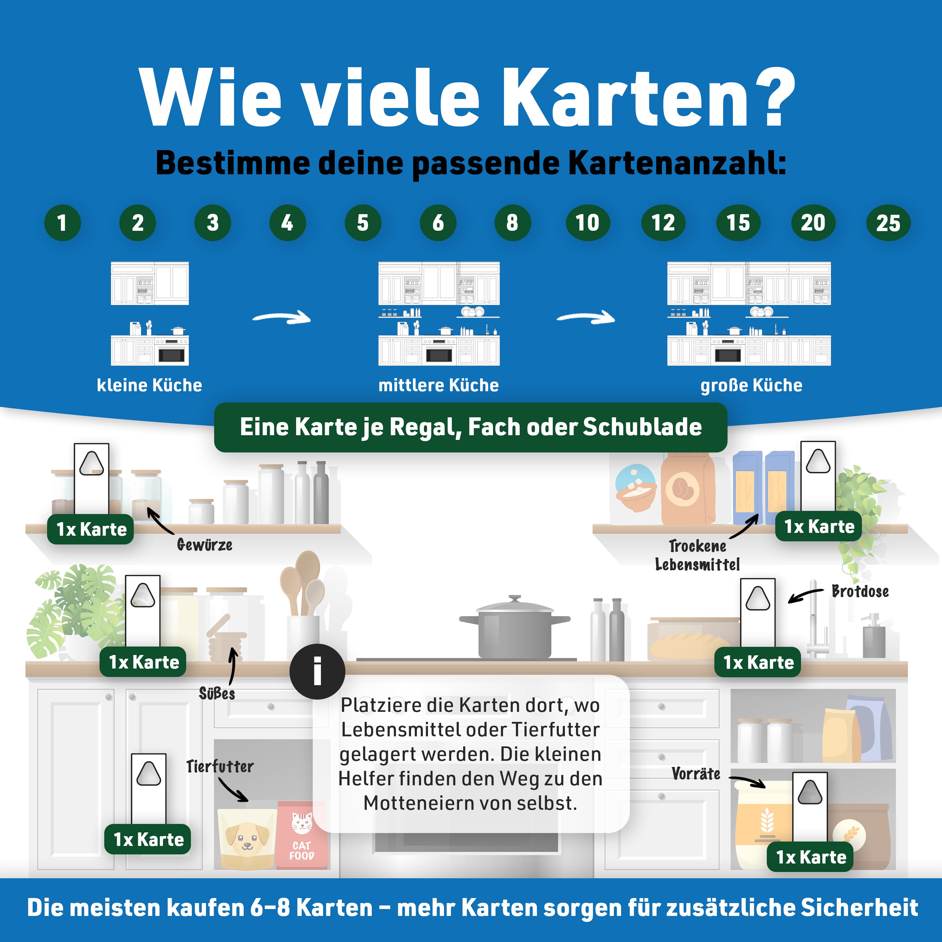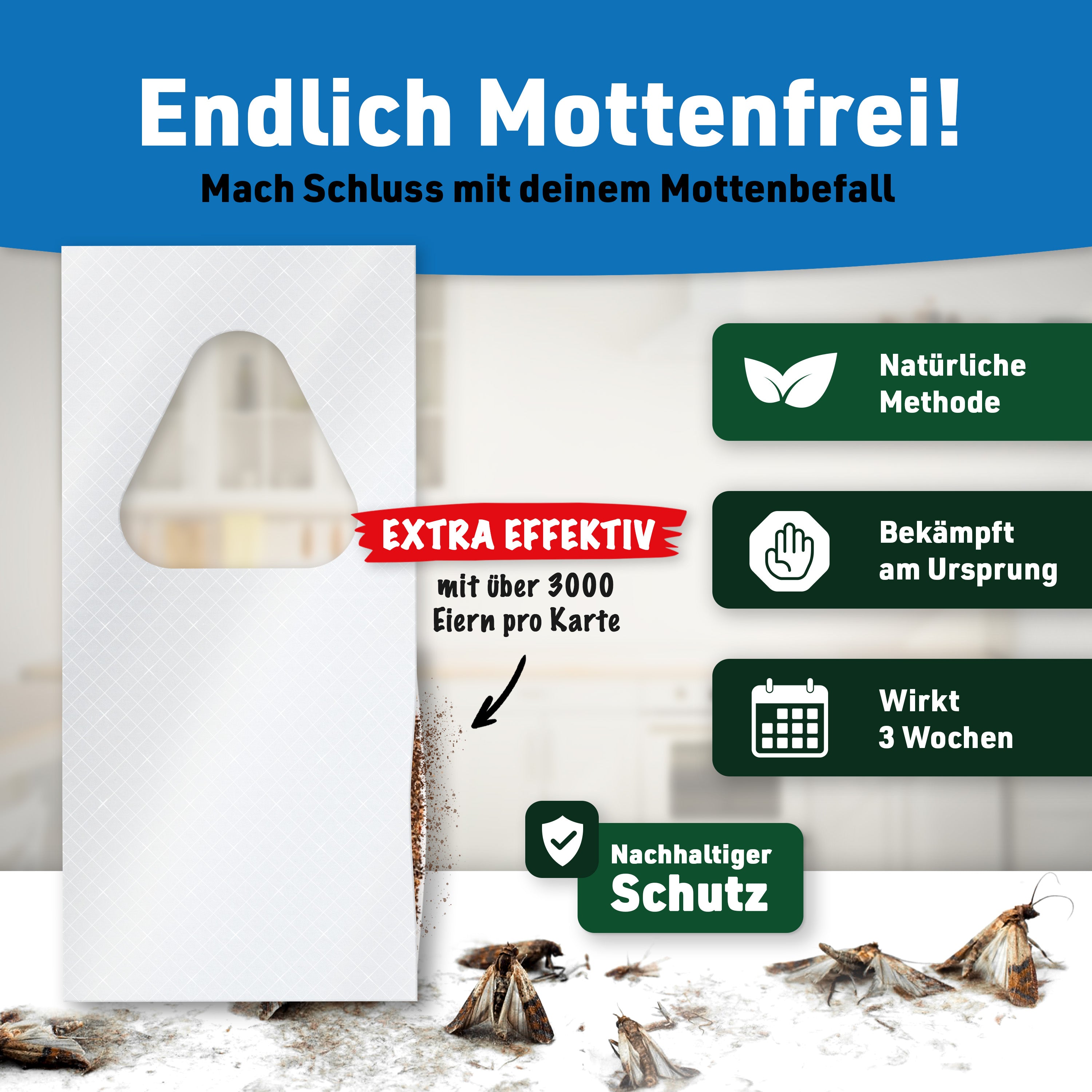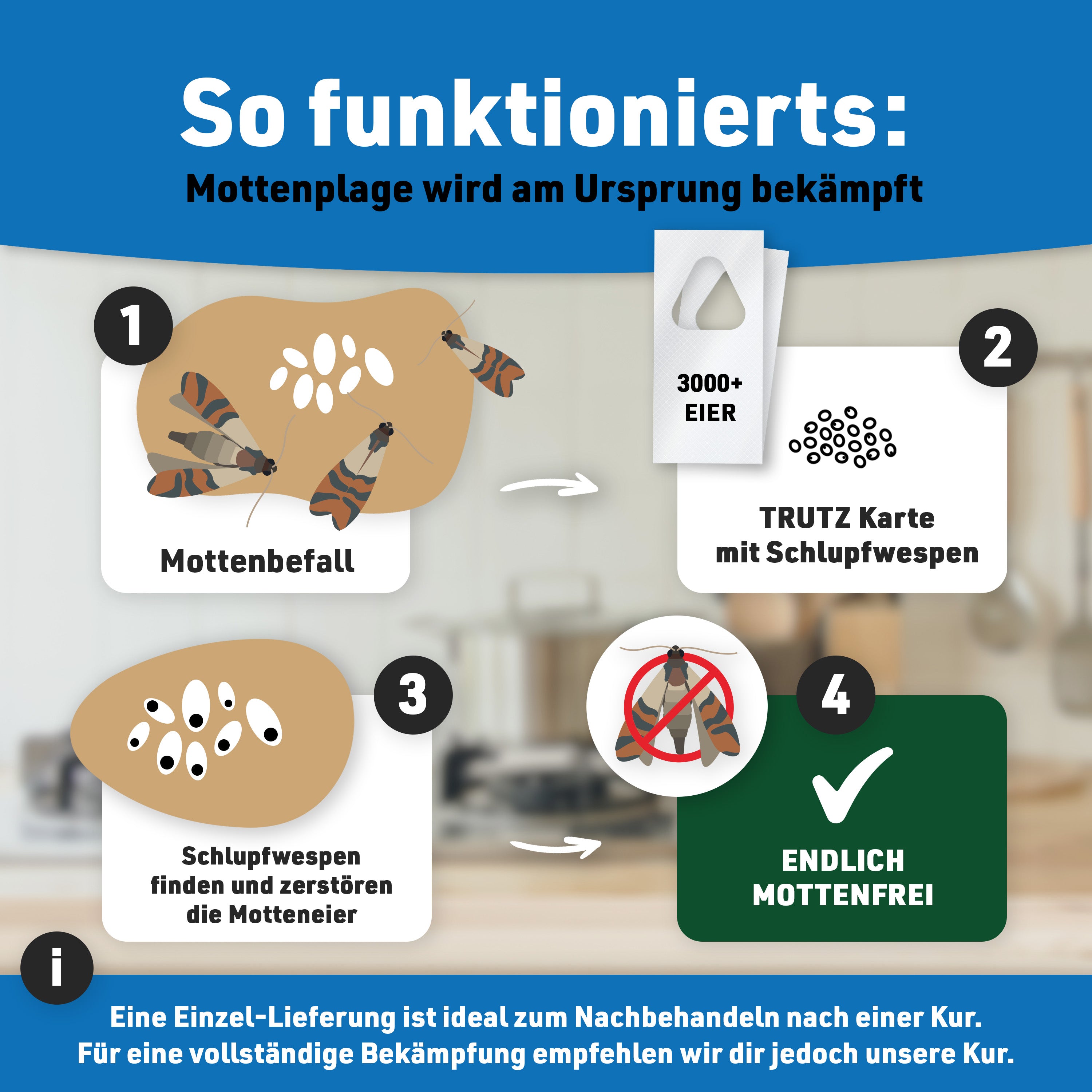 In der Regel dauert die Anwendung 8 bis 12 Wochen. Während dieser Zeit werden regelmäßig neue Schlupfwespen geliefert, damit alle Mottenstadien zuverlässig bekämpft werden.