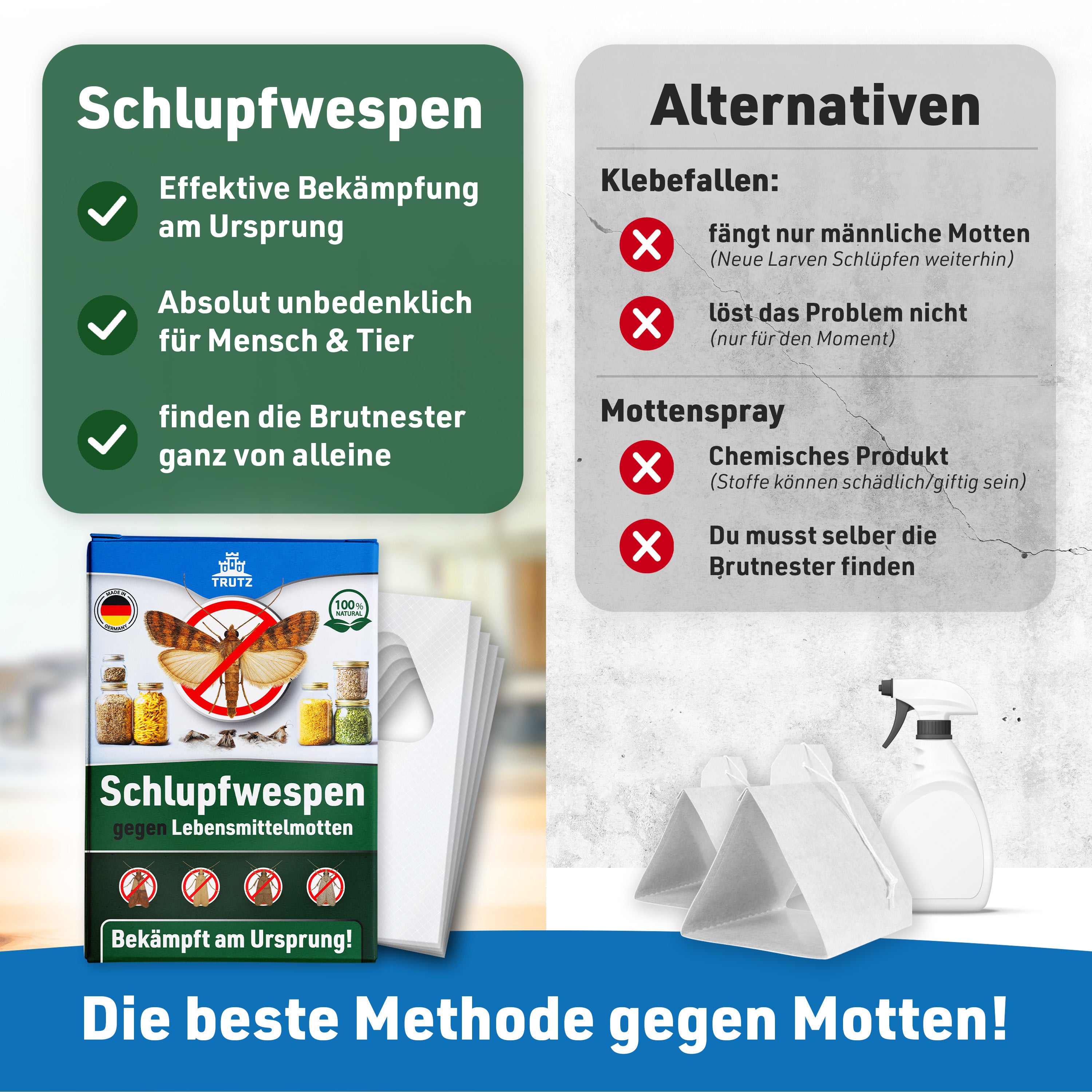 Schlupfwespen sind winzige, für den Menschen unsichtbare Nützlinge. Sie legen ihre Eier in die Eier der Lebensmittelmotten und verhindern so deren Entwicklung – ganz ohne Chemie.